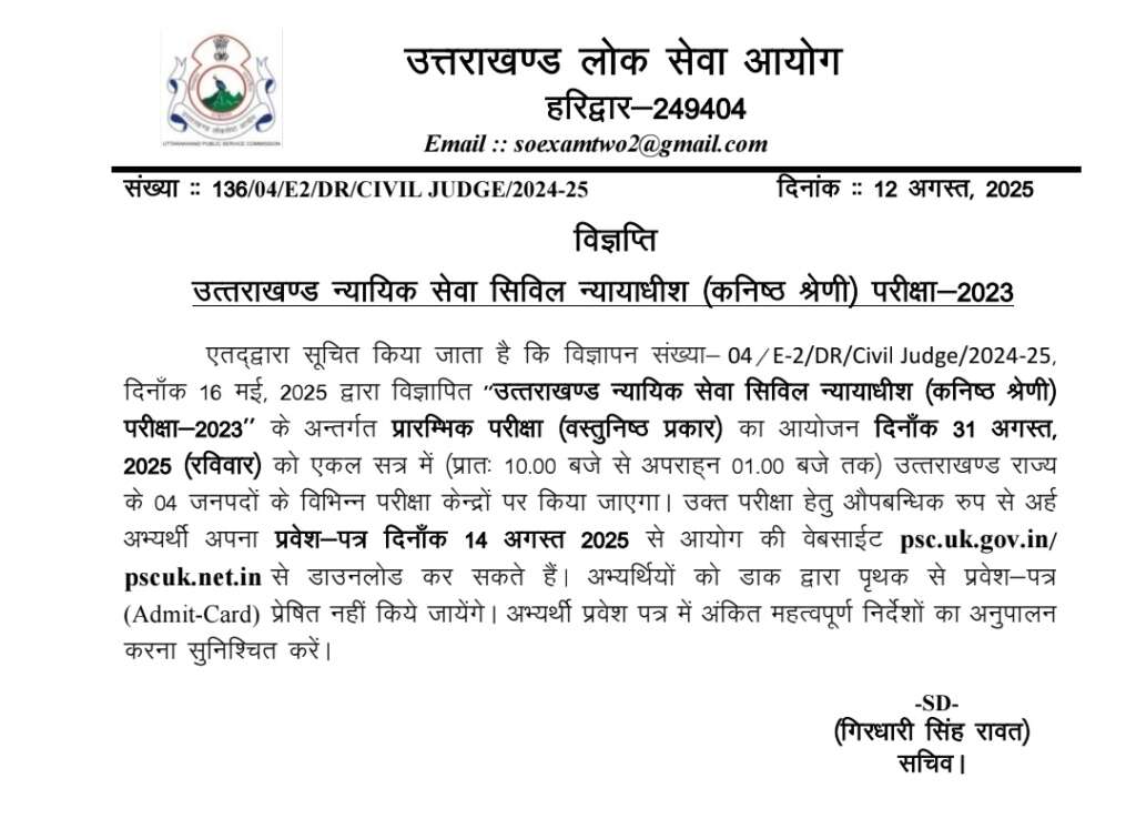 एतद्वारा सूचित किया जाता है कि विज्ञापन संख्या-04/E-2/DR/Civil Judge/2024-25, दिनाँक 16 मई, 2025 द्वारा विज्ञापित “उत्तराखण्ड न्यायिक सेवा सिविल न्यायाधीश (कनिष्ठ श्रेणी) परीक्षा-2023” के अन्तर्गत प्रारम्भिक परीक्षा (वस्तुनिष्ठ प्रकार) का आयोजन दिनाँक 31 अगस्त, 2025 (रविवार) को एकल सत्र में (प्रातः 10.00 बजे से अपराह्न 01.00 बजे तक) उत्तराखण्ड राज्य के 04 जनपदों के विभिन्न परीक्षा केन्द्रों पर किया जाएगा। उक्त परीक्षा हेतु औपबन्धिक रुप से अर्ह अभ्यर्थी अपना प्रवेश-पत्र दिनाँक 14 अगस्त 2025 से आयोग की वेबसाईट psc.uk.gov.in/pscuk.net.in से डाउनलोड कर सकते हैं। अभ्यर्थियों को डाक द्वारा पृथक से प्रवेश-पत्र (Admit-Card) प्रेषित नहीं किये जायेंगे। अभ्यर्थी प्रवेश पत्र में अंकित महत्वपूर्ण निर्देशों का अनुपालन करना सुनिश्चित करें।