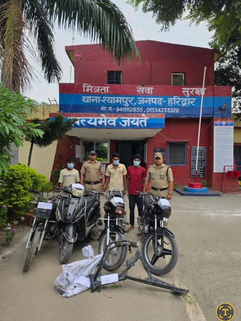 घटनास्थल के आस-पास इलेक्ट्रानिक माध्यम से एवं चोरी गये वाहन की तलाश हेतु थाना क्षेत्र में लगातार स्थान बदल-2 कर पुलिस टीमों द्वारा संदिग्ध वाहन /व्यक्तियों की चैकिंग की कार्यवाही के दौरान दिनांक -05.10.25 को 4.2 माईल स्टोन पर पुलिस टीम द्वारा चैकिंग के दौरान एक मोटर साईकिल पर सवार तीन व्यक्ति 1-हिमांशु कुमार पुत्र मुन्नू सिंह निवासी ग्राम रामदासवाली थाना मण्डावली जिला बिजनौर उ0प्र0, 2- ओमप्रकाश पुत्र जसवंत सिंह निवासी ग्राम शाहपुरा रत्न थाना कीरतपुर जिला बिजनौर उ0प्र0,3-अर्पित पुत्र धर्मपाल सिंह निवासी हाल पता C/O सतीश चौहान ग्राम धारीवाला थाना पथरी जिला हरिद्वार मूल पता ग्राम हरचन्दपुर थाना नांगल सोती जिला बिजनौर उ0प्र0 को रोककर चैक किया तो उक्त तीनों व्यक्तियों से मुकदमा उपरोक्त से चोरी हुयी मोटर साईकिल बरामद हुई।