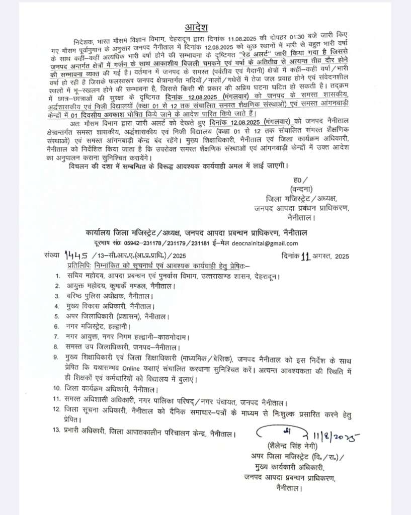 अन्तर्गत क्षेत्रों में गर्जन के साथ आकाशीय बिजली चमकने एवं वर्षा के अतितीव्र से अत्यन्त तीव्र दौर होने की सम्भावना व्यक्त की गई है। वर्तमान में जनपद के समस्त (पर्वतीय एवं मैदानी) क्षेत्रों में कहीं-कहीं वर्षा/भारी वर्षा हो रही है जिसके फलस्वरूप जनपद क्षेत्रान्तर्गत नदियों / नालों / गधेरों में तेज जल प्रवाह होने एवं संवेदनशील स्थलों में भू-स्खलन होने की सम्भावना है, जिससे किसी भी प्रकार की अप्रिय घटना घटित हो सकती है। तद्क्रम में छात्र-छात्राओं की सुरक्षा के दृष्टिगत दिनांक 12.08.2025 (मंगलवार) को जनपद के समस्त शासकीय, अर्द्धशासकीय एवं निजी विद्यालयों (कक्षा 01 से 12 तक संचालित समस्त शैक्षणिक संस्थाओं) एवं समस्त आंगनबाड़ी केन्द्रों में 01 दिवसीय अवकाश घोषित किये जाने के आदेश पारित किये जाते हैं। अतः मौसम विभाग द्वारा जारी अलर्ट को देखते हुए दिनांक 12.08.2025 (मंगलवार) को जनपद नैनीताल क्षेत्रान्तर्गत समस्त शासकीय, अर्द्धशासकीय एवं निजी विद्यालय (कक्षा 01 से 12 तक संचालित संमस्त शैक्षणिक संस्थाओं) एवं समस्त आंगनबाड़ी केन्द्र बंद रहेंगे। मुख्य शिक्षाधिकारी, नैनीताल एवं जिला कार्यक्रम अधिकारी, नैनीताल को निर्देशित किया जाता है कि उपरोक्त समस्त शैक्षणिक संस्थाओं एवं आंगनबाड़ी केन्द्रों में उक्त आदेश का अनुपालन कराना सुनिश्चित करायेंगे। विचलन की दशा में सम्बन्धित के विरूद्ध आवश्यक कार्यवाही अमल में लाई जाएगी। ह०/(वन्दना) जिला मजिस्ट्रेट / अध्यक्ष, जनपद आपदा प्रबंधन प्राधिकरण, नैनीताल। कार्यालय जिला मजिस्ट्रेट / अध्यक्ष, जनपद आपदा प्रबन्धन प्राधिकरण, नैनीताल दूरभाष सं०: 05942-231178/231179/231181 ई-मेल deocnainital@gmail.com संख्या 1445/13-सी.आर.ए. (आ.प्र.प्राधि.) / 2025 दिनांक 11 अगस्त, 2025 प्रतिलिपिः निम्नांकित को सूचनार्थ एवं आवश्यक कार्यवाही हेतु प्रेषितः- 1. सचिव महोदय, आपदा प्रबन्धन एवं पुनर्वास विभाग, उत्तराखण्ड शासन, देहरादून। 2. आयुक्त महोदय, कुमाऊँ मण्डल, नैनीताल। 3. वरिष्ठ पुलिस अधीक्षक, नैनीताल। 4. मुख्य विकास अधिकारी, नैनीताल। 5. अपर जिलाधिकारी (प्रशासन), नैनीताल। 6. नगर मजिस्ट्रेट, हल्द्वानी। 7. नगर आयुक्त, नगर निगम हल्द्वानी काठगोदाम। 8. समस्त उप जिलाधिकारी, जनपद-नैनीताल। 9. मुख्य शिक्षाधिकारी एवं जिला शिक्षाधिकारी (माध्यमिक/ बेसिक), जनपद नैनीताल को इस निर्देश के साथ प्रेषित कि यथासम्भव Online कक्षाएं संचालित करवाना सुनिश्चित करें। अत्यन्त आवश्यकता की स्थिति में ही शिक्षकों एवं कर्मचारियों को विद्यालय में बुलाएं। 10. जिला कार्यक्रम अधिकारी, नैनीताल। 11 . समस्त अधिशासी अधिकारी, नगर पालिका परिषद्/नगर पंचायत, जनपद नैनीताल। 12. जिला सूचना अधिकारी, नैनीताल को दैनिक समाचार पत्रों के माध्यम से निःशुल्क प्रसारित करने हेतु प्रे