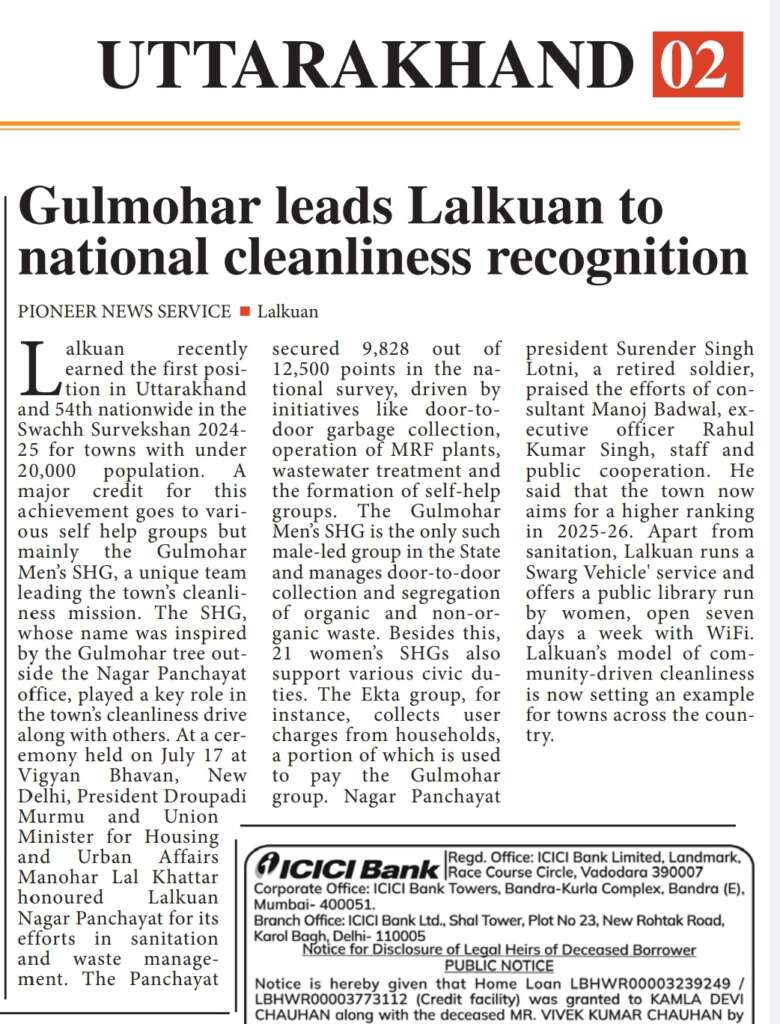 लालकुआं -: स्वच्छता सर्वेक्षण में लालकुआं को बीस हजार से कम जनसंख्या वाले कुल 2035 नगरों की श्रेणी में देश में 54वां और राज्य में पहला स्थान प्राप्त कराने के लिए
