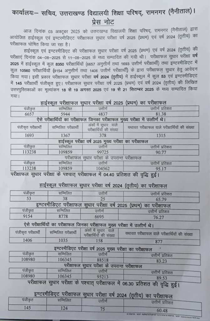 उत्तराखण्ड विद्यालयी शिक्षा परिषद्, रामनगर ने आज हाईस्कूल एवं इंटरमीडिएट परीक्षाफल सुधार परीक्षा वर्ष 2025 (प्रथम) एवं वर्ष 2024 (तृतीय) के परिणाम घोषित कर दिए।