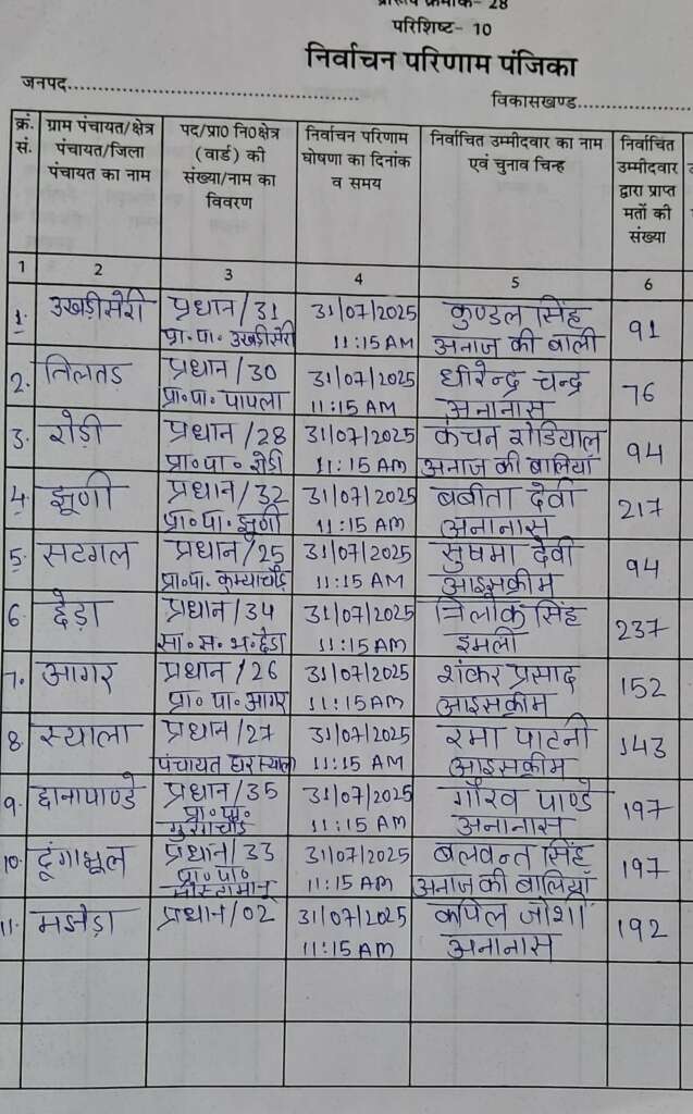 लोहाघाट क्षेत्र पंचायत जाखजिंडी- 1 से प्रकाश सिंह विजयी, कुल प्राप्त मत 182
