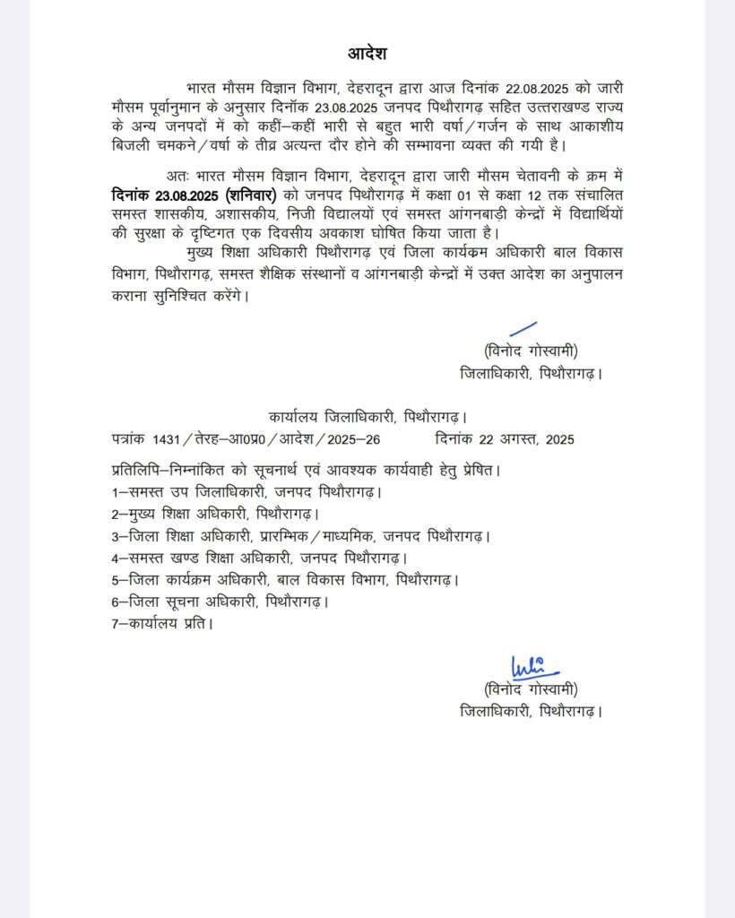 मौसम विभाग की चेतावनी को गंभीरता से लेते हुए जिलाधिकारी पिथौरागढ़ विनोद गोस्वामी ने आदेश जारी कर जिले के समस्त शासकीय, अशासकीय एवं निजी विद्यालयों में कक्षा 1 से 12 तक की कक्षाएं तथा सभी आंगनबाड़ी केन्द्रों को विद्यार्थियों की सुरक्षा के दृष्टिगत एक दिवसीय अवकाश घोषित किया है।