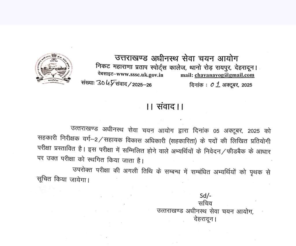 उत्तराखण्ड अधीनस्थ सेवा चयन आयोग (UKSSSC) ने सहकारी निरीक्षक वर्ग-2 एवं सहायक विकास अधिकारी (सहकारिता) पदों के लिए प्रस्तावित लिखित परीक्षा को स्थगित करने की घोषणा की है। यह परीक्षा 5 अक्टूबर 2025 को आयोजित होनी थी।