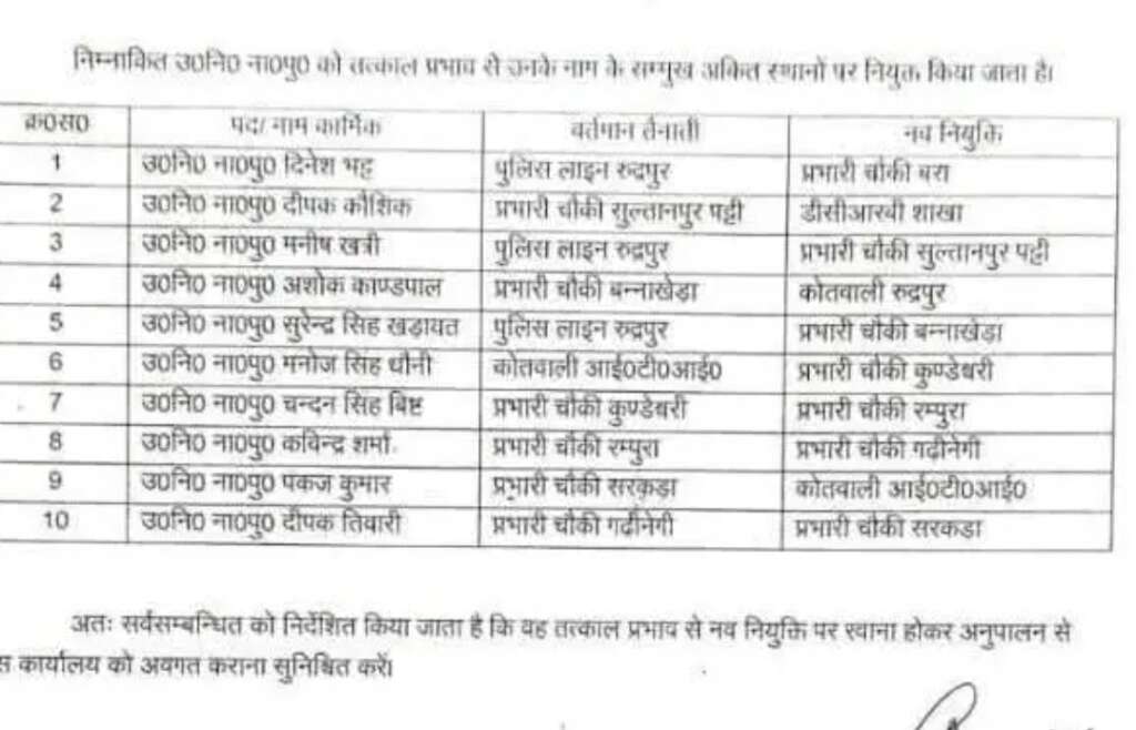 इसके अलावा मनोज सिंह धामी को कोतवाली आईटीआई से प्रभारी चौकी कुण्डेश्वरी, चंदन सिंह बिष्ट को प्रभारी चौकी कुण्डेश्वरी से प्रभारी चौकी खटीमा, तथा नवीन शर्मा को प्रभारी चौकी रुद्रपुर से प्रभारी चौकी रम्पुरा भेजा गया है। फक्कड़ कुमार को प्रभारी चौकी सरकड़ा से कोतवाली आईटीआई और दीपक बिष्ट को प्रभारी चौकी महेंद्री से प्रभारी चौकी सरकड़ा में तैनाती दी गई है।