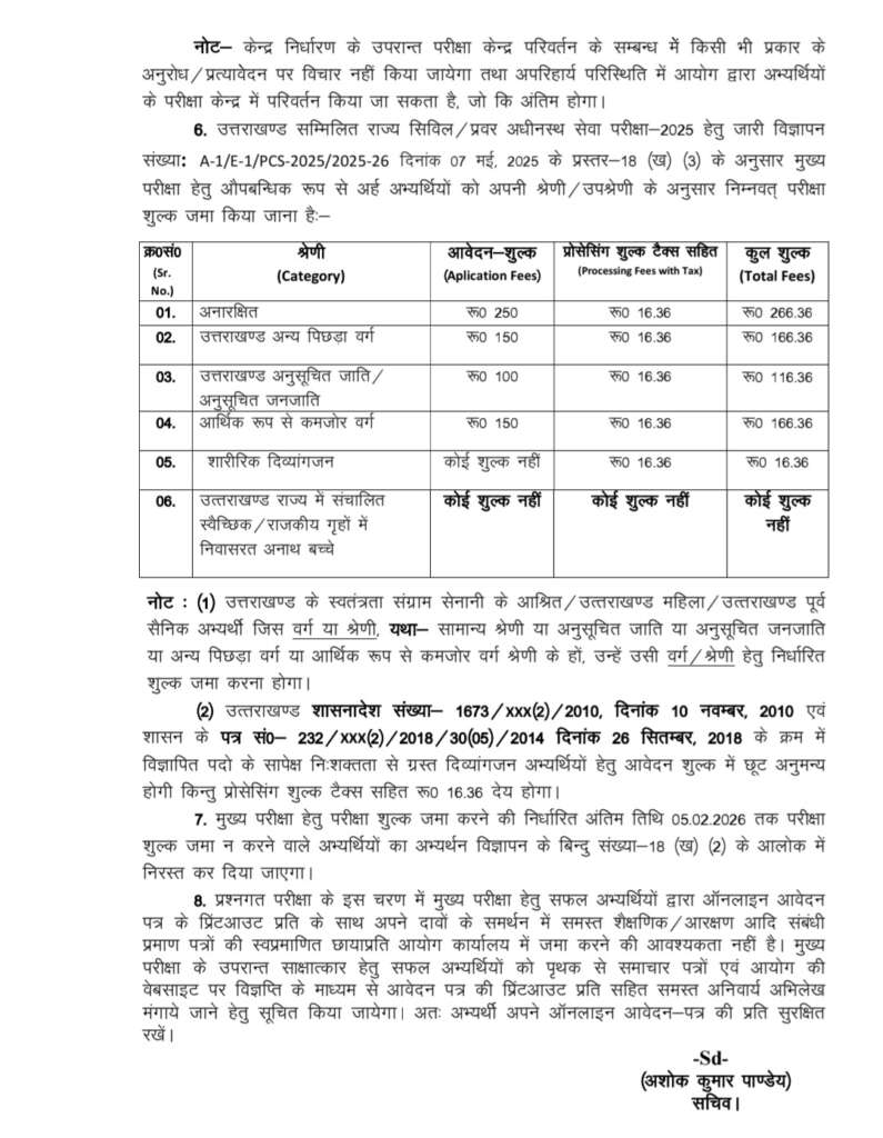 - उक्त संशोधित परीक्षा परिणाम में सफल घोषित 50 नये अभ्यर्थियों तथा प्रारम्भिक परीक्षा के निरस्त किये गये परीक्षा परिणाम दिनांक 08 अक्टूबर, 2025 में सफल घोषित ऐसे अभ्यर्थी, जिनका मुख्य परीक्षा का शुल्क जमा न करने के कारण अभ्यर्थन निरस्त किया गया था और वे संशोधित परीक्षा परिणाम दिनांक 06 जनवरी, 2026 में भी सफल घोषित हुए हों, द्वारा माह अप्रैल, 2026 में हरिद्वार एवं हल्द्वानी नगर के विभिन्न परीक्षा केन्द्रों में आयोजित होने वाली मुख्य परीक्षा हेतु परीक्षा शुल्क जमा किया जाना एवं उक्त परीक्षा हेतु नगर के विकल्प का चयन किया जाना है। इस हेतु अभ्यर्थी आयोग की वेबसाइट www.psc.uk.gov.in पर दिये गये लिंक का प्रयोग करते हुए निर्धारित अंतिम तिथि 05.02.2026 तक मुख्य परीक्षा हेतु नगर के विकल्प का चयन करते हुए परीक्षा शुल्क जमा करना सुनिश्चित करें।