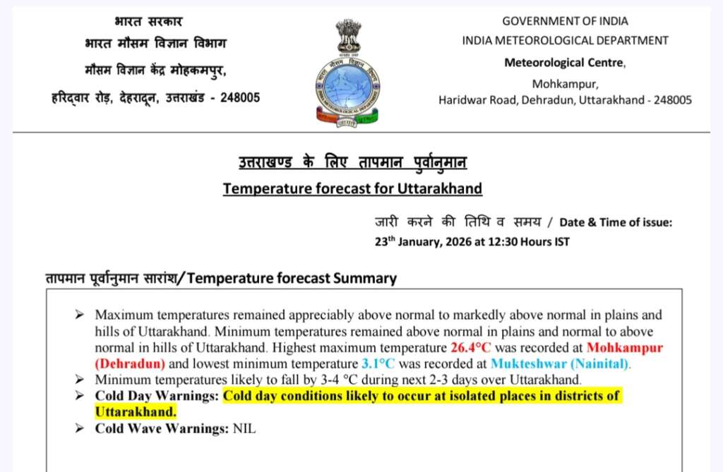 राज्य में सर्वाधिक अधिकतम तापमान 26.4 डिग्री सेल्सियस मोहकमपुर (देहरादून) में दर्ज किया गया, जबकि सबसे कम न्यूनतम तापमान 3.1 डिग्री सेल्सियस मुक्तेश्वर (नैनीताल) में रिकॉर्ड किया गया।